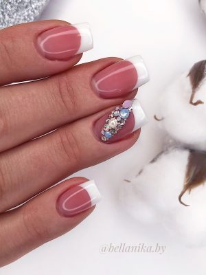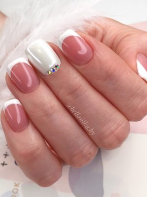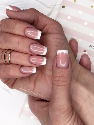 Одним из наиболее распространенных вариантов дизайна ногтей является французский маникюр, при котором ногтевая пластина покрывается бледно-розовым либо бежевым лаком, а кончик ногтя окрашивается в белый цвет.